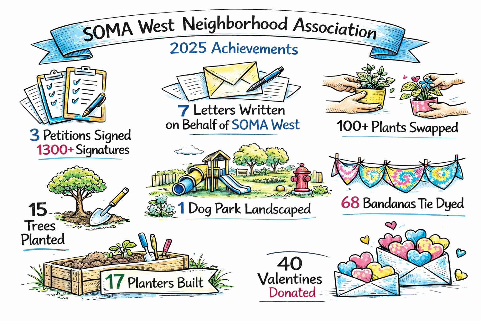The year also brought hands-on improvements across the neighborhood, including 15 trees planted, 17 planters built, 100+ plants swapped, and the landscaping of a local dog park. Community creativity and care were on full display as volunteers tie-dyed 68 bandanas and donated 40 valentines, spreading connection and joy.
